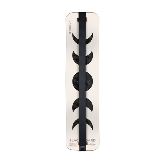 Gibbon Moon SlackBoard Wooden Moon SlackBoard on a white background Gibbon Moon SlackBoard with text for why you'll love it Gibbon Moon SlackBoard with product specs Person standing on a moon slackboard on grass Person riding a moon slackboard on a patio with a modern house in the background Person planking on a moon slackboard with one arm raised Women doing yoga with a moon slackboard